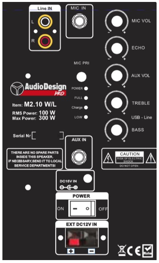 AudioDesignPRO M2 10WL-mallissa on akkutoiminto, Bluetooth, USB/SD. Ääntä saa siis kuuluviin kaikilla nykypäivän tavoilla. AudioDesignPRO M2 sopii niin karaokeen koteihin tai kevyeen keikkakäyttöön, puhujille, seminaareihin ja mihin vaan missä tarvitaan saada ääntä kuuluviin. Sitä voi käyttää myös ulkona ja siinä on vetopyörät ja kahva kuljettamista varten. Kaiuttimen takaosassa ovat selkeät säätimet perussäätöjö varten. Kaiuttimen yläosassa on suuri volumen säätö nappula ja audion valintakytkin. Myös kaukosäädin kuuluu tuotepakettiin vakiona.
