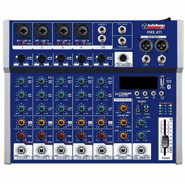 AudioDesignPRO PMX.411 USB mikseri FX/BT:ssä on kaikki nykypäivän herkut kuten langaton musiikin soitto Bluetoothilla, laadukkaat kaiku ja muut efektit, sekä USB-tikkusoitin ja suora liitäntä USB:llä tietokoneeseen. USB-liitännällä tietokoneeseen saat soitettua musiikkia tietokoneelta suoraan USB-liitännän kautta ilman muita kaapeleita tietokoneen ja mikserin välillä. Myös kolmialueinen EQ (low, middle, treble säädöt) on tärkeässä osassa miksatessa. Voit myös halutessasi tallentaa soiton ja laulun mikseriin liitetylle USB-tikulle (max. koko 32 gb) tai suoraan tietokoneellesi USB-johdolla.