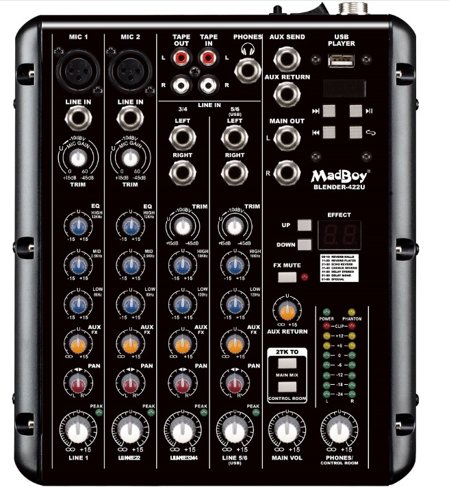 MadBoy on pakannut yhteen loistavaan pakettiin niin sanottujen ”perinteisten pikkumikserien” ominaisuudet ja maustanut sen karaokekansaa ihastuttavilla toiminnoilla, kuten esimerkiksi stereokanavien RCA-liittimillä ja loistavalla digitaalisella kaiku-/efektiprosessorilla. Ammattilaisten työtä helpottaa integroitu USB-soitin, jolla onnistuu tausta- ja väliaikamusiikin soittaminen helposti. Lataat vain musat USB-tikulle, tikku kiinni mikseriin ja show pyörimään!