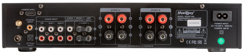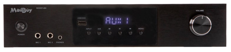 Tämä digitaalinen Bluetooth-karaokevahvistin yhdistää 400 watin tehokkuuden ja monipuoliset liitännät kompaktissa, vain 36 cm leveässä rungossa. Kooltaan pienempi, mutta ääneltään suuri – täydellinen valinta niin kotiin, ravintolaan kuin mökkikäyttöön. MadBoy BOOST 404 karaokevahvistin tarjoaa kaksi mikrofonisisääntuloa etupaneelissa, yhteisen äänenvoimakkuuden säädön, kaksialueisen taajuuskorjaimen sekä kaiun voimakkuuden säädön.