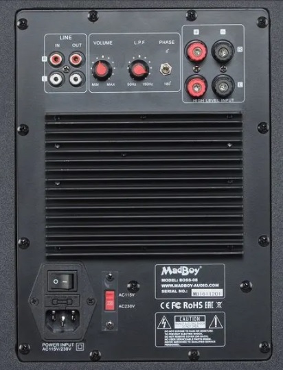 MadBoy BOSS-08D subwoofer 120 W on pienikokoinen aktiivisubbari, joka parantaa minkä tahansa laitteiston soundin, tuoden siihen pehmeän basson jyrinän… MadBoy BOSS-08 on loistava lisä mihin tahansa kotikaraokelaitteistoon. Saat lisättyä sillä karaokesoundiisi kaivattua bassoa. Siis sitä oikeaa jytinää!!